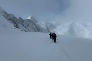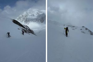 Der anschließende Anstieg verläuft zunächst technisch einfach und führt uns bis zum Skidepot unterhalb des Gipfels. Bei guten Verhältnissen ist der weitere Weg zum höchsten Punkt ein lohnendes Ziel. An diesem Tag machten uns allerdings starker Wind und schlechte Sicht einen Strich durch die Rechnung, sodass wir den letzten Abschnitt nicht mehr angehen konnten. 🌬️🌫️